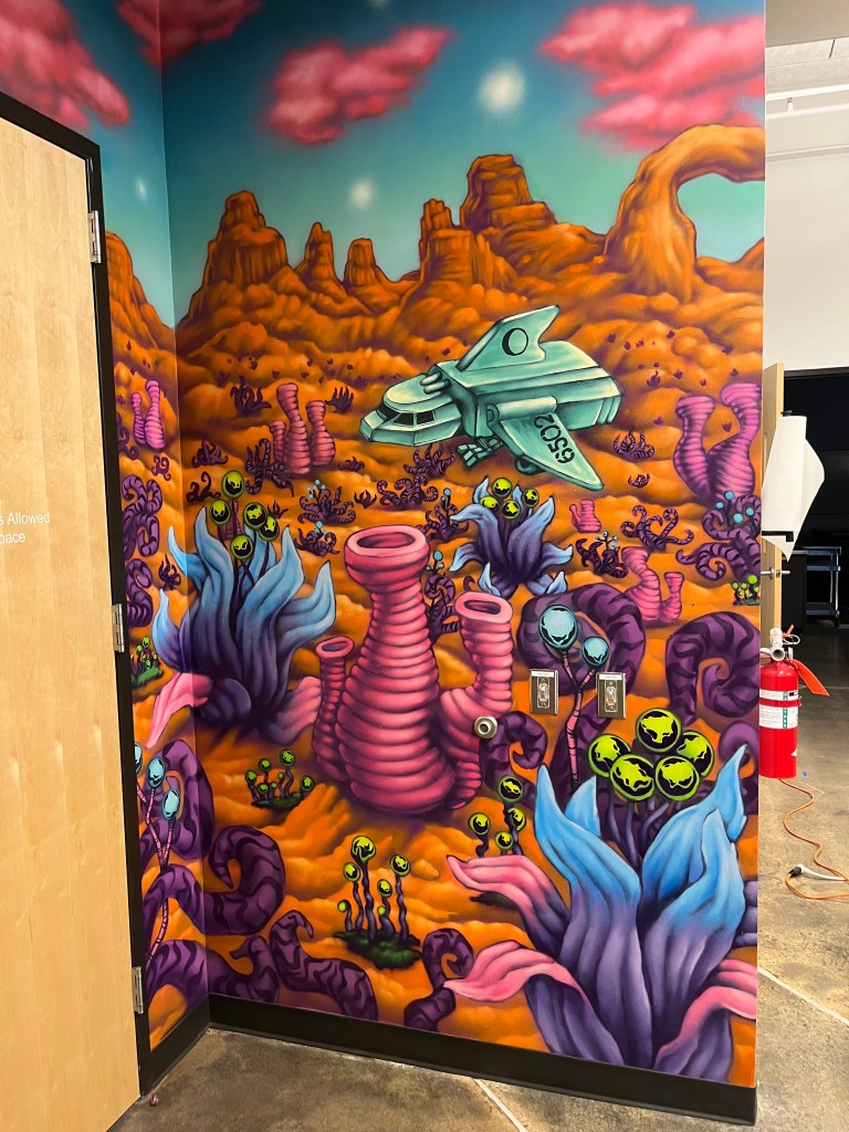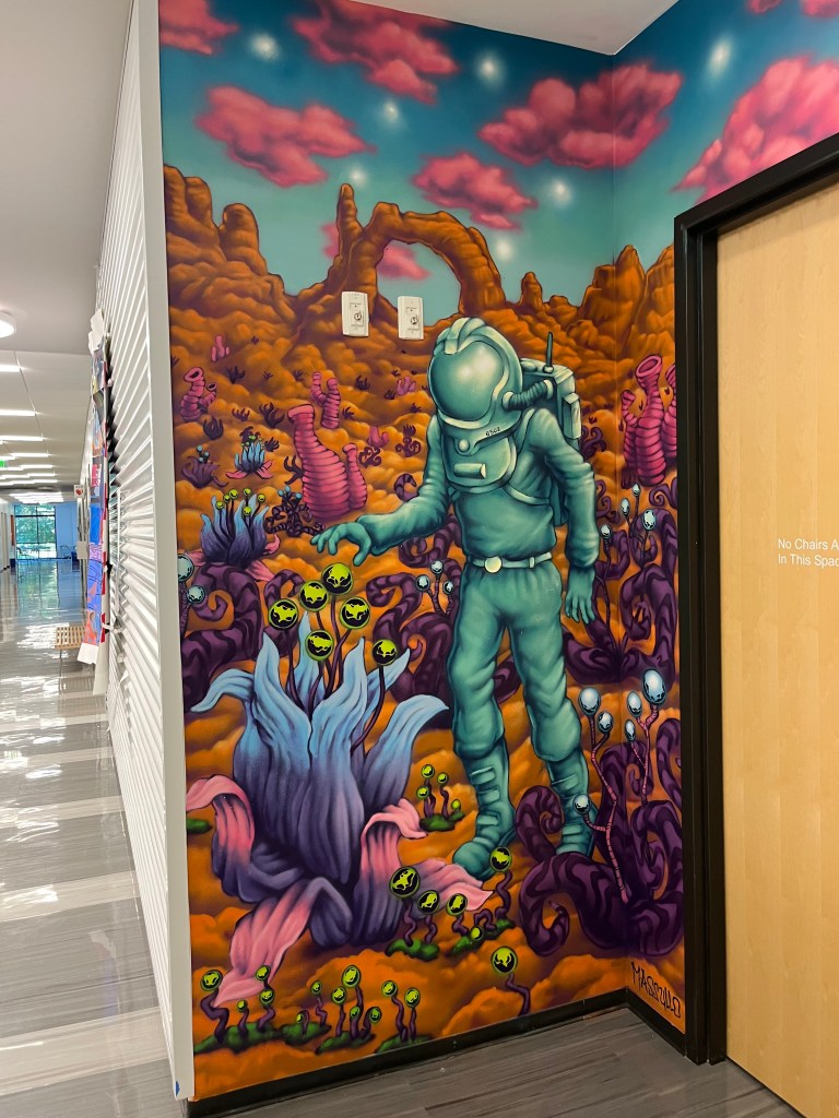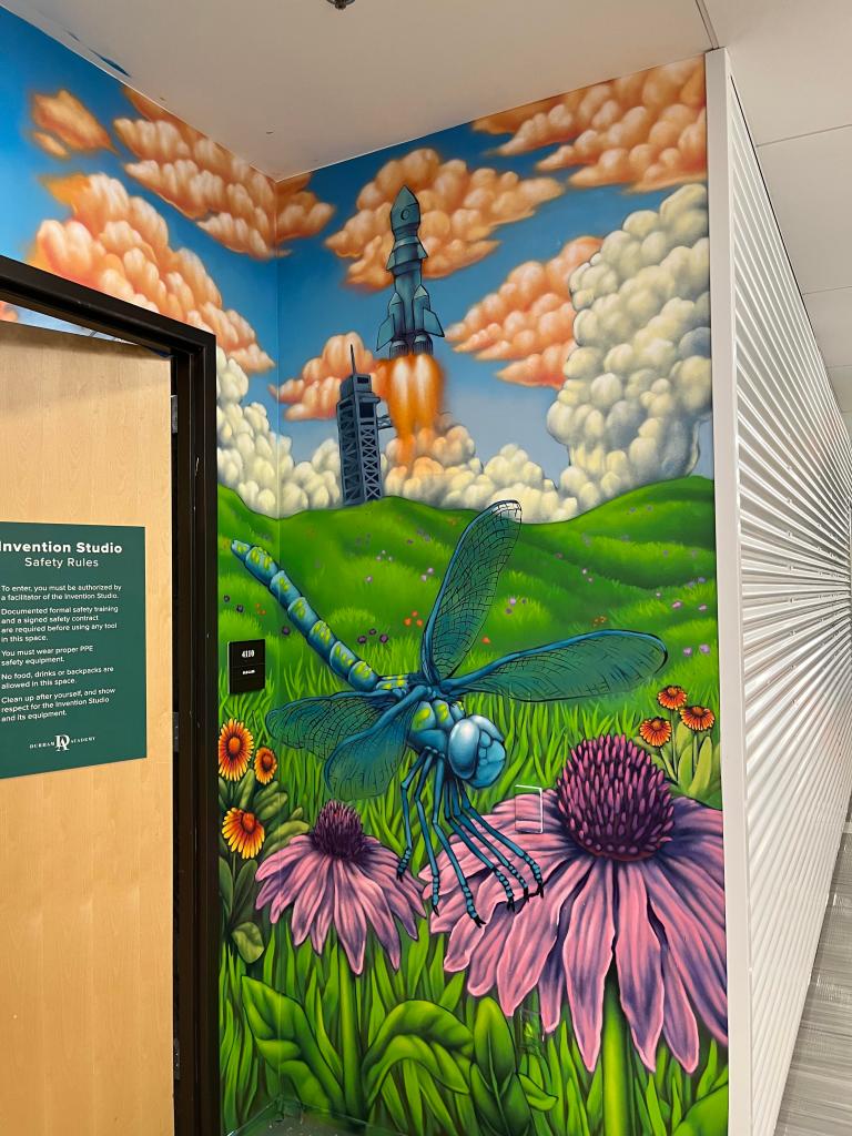 In the summer of 2025 I collaborated with a robotics and engineering teacher at Durham Academy, in North Carolina. This image created with all spray paint was meant to demonstrate how the natural world can inspire technological development.
